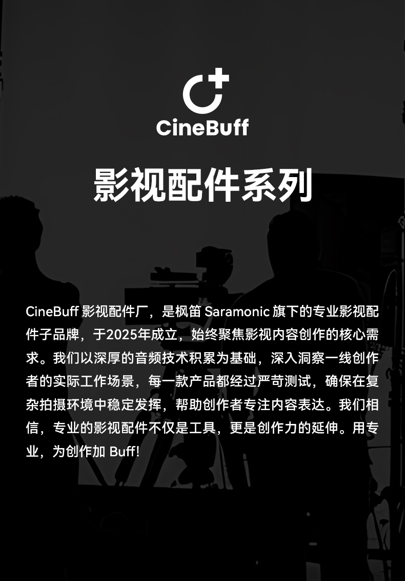 CineBuff 影视配件厂,是枫笛 Saramonic 旗下的专业影视配件子品牌,于2025年成立,始终聚焦影视内容创作的核心需求。我们以深厚的音频技术积累为基础,深入洞察一线创作者的实际工作场景,每一款产品都经过严苛测试,确保在复杂拍摄环境中稳定发挥,帮助创作者专注内容表达。我们相信,专业的影视配件不仅是工具,更是创作力的延伸。用专业,为创作加 Buff!